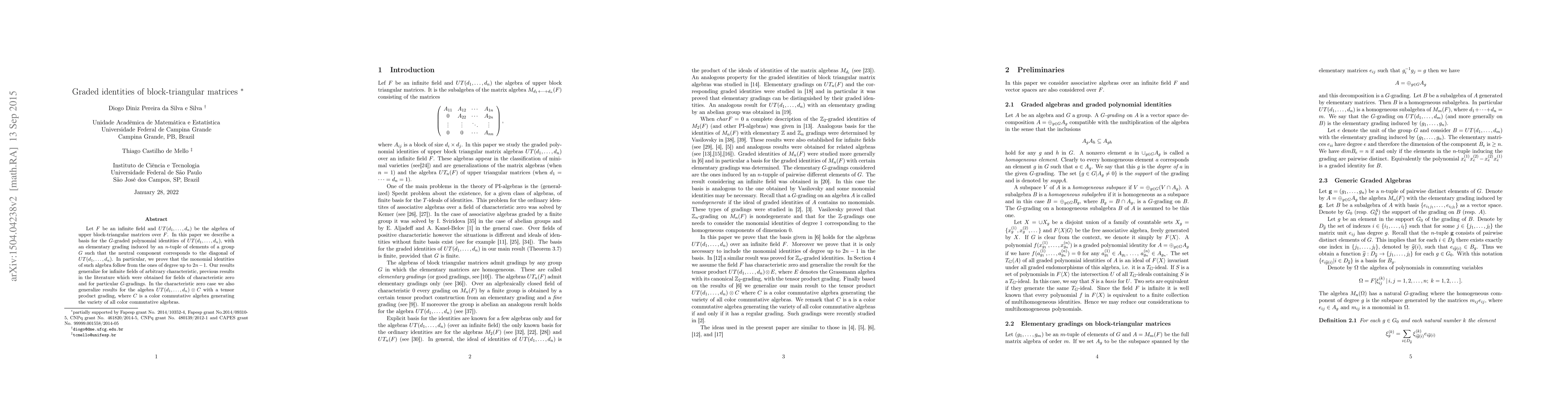 Let $F$ be an infinite field and $UT(d_1,\dots, d_n)$ be the algebra of upper block-triangular matrices over $F$. In this paper we describe a basis for the $G$-graded polynomial identities of $UT(d_1,\dots, d_n)$, with an elementary grading induced by an $n$-tuple of elements of a group $G$ such that the neutral component corresponds to the diagonal of $UT(d_1,\dots,d_n)$. In particular, we prove that the monomial identities of such algebra follow from the ones of degree up to $2n-1$. Our results generalize for infinite fields of arbitrary characteristic, previous results in the literature which were obtained for fields of characteristic zero and for particular $G$-gradings. In the characteristic zero case we also generalize results for the algebra $UT(d_1,\dots, d_n)\otimes C$ with a tensor product grading, where $C$ is a color commutative algebra generating the variety of all color commutative algebras.