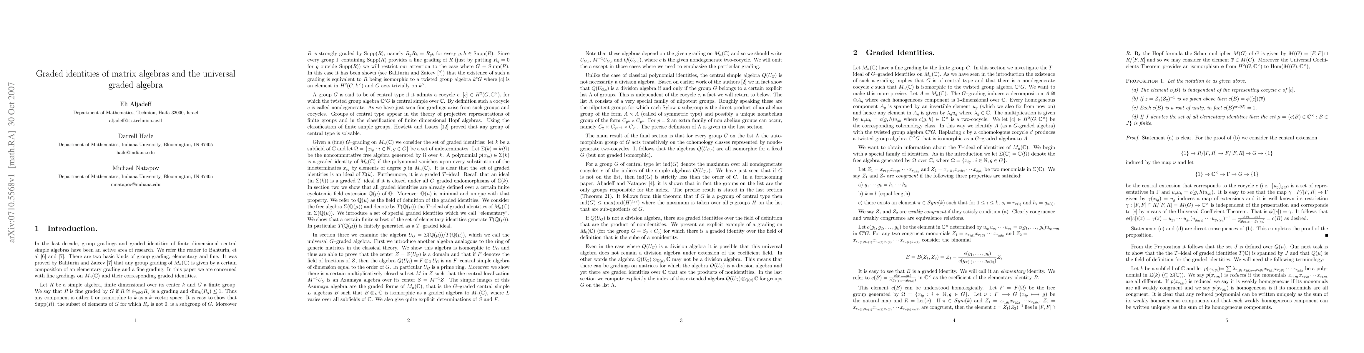 This paper explores fine G-gradings on matrix algebras over complex numbers, proving that the ideal of graded identities is finitely generated by elementary binomial identities. It constructs a universal graded algebra and shows it is Azumaya over its center, with homomorphic images being G-graded forms of the matrix algebra. The paper also demonstrates that for certain nilpotent groups, the ring of central quotients is a division algebra, leading to the existence of non-identity polynomial graded identities for specific groups.