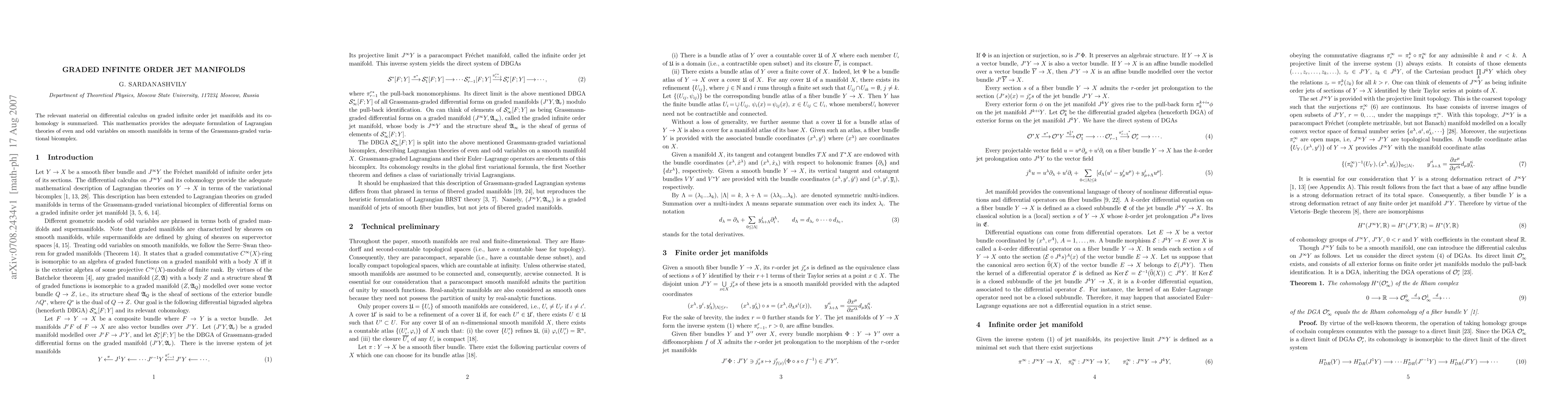 The relevant material on differential calculus on graded infinite order jet manifolds and its cohomology is summarized. This mathematics provides the adequate formulation of Lagrangian theories of even and odd variables on smooth manifolds in terms of the Grassmann-graded variational bicomplex.