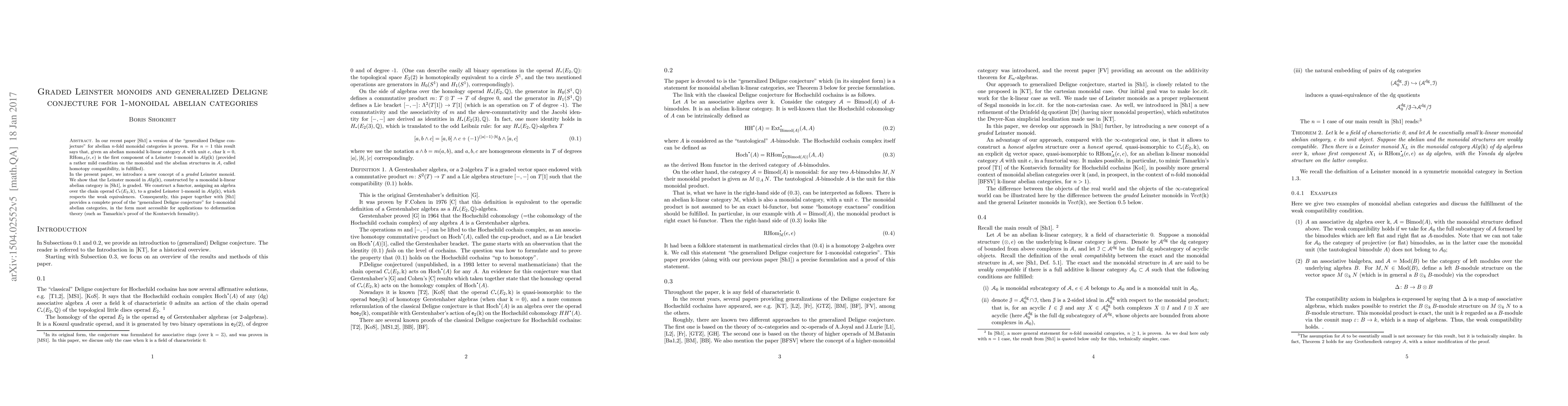 This paper introduces the concept of graded Leinster monoids and proves that the Leinster monoid in $\mathscr{A}lg(k)$ is graded. It constructs a functor linking graded Leinster 1-monoids to algebras over the chain operad $C(E_2,k)$, thus completing the proof of the generalized Deligne conjecture for 1-monoidal abelian categories in a form suitable for deformation theory applications.