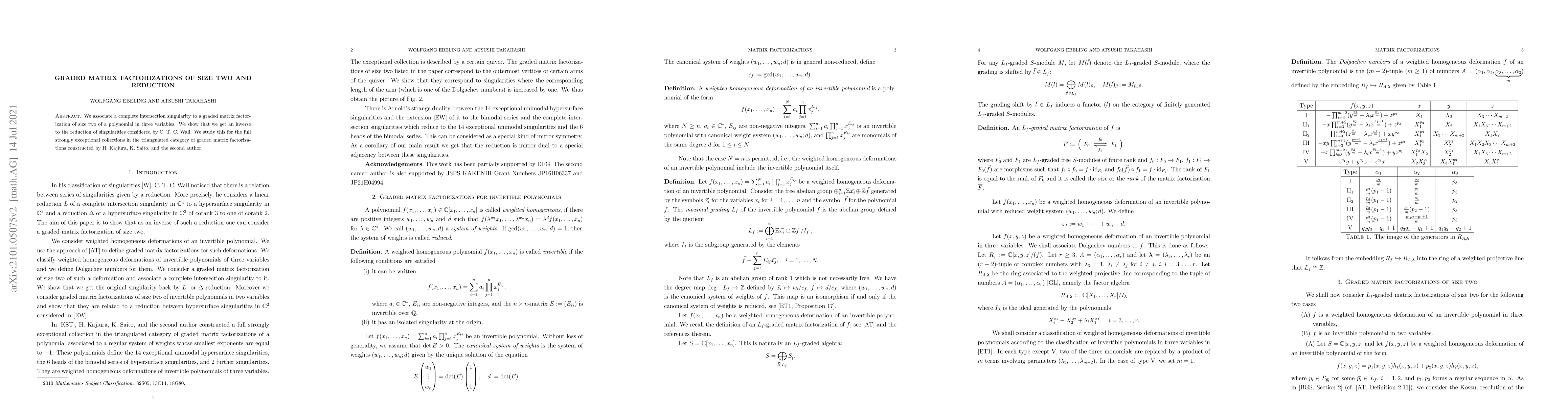 We associate a complete intersection singularity to a graded matrix factorization of size two of a polynomial in three variables. We show that we get an inverse to the reduction of singularities considered by C.T.C.Wall. We study this for the full strongly exceptional collections in the triangulated category of graded matrix factorizations constructed by H.Kajiura, K.Saito, and the second author.
