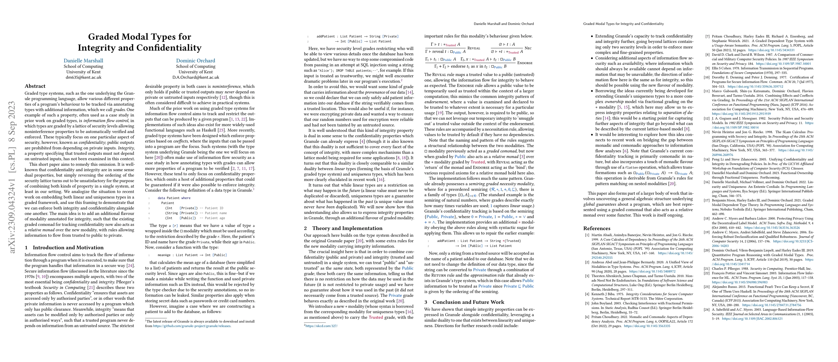 This paper introduces graded modal types to simultaneously enforce both confidentiality and integrity in programming languages. It extends the Granule programming language's type system to include an additional modality for integrity, allowing for the enforcement of noninterference properties while ensuring trusted outputs do not depend on untrusted inputs.