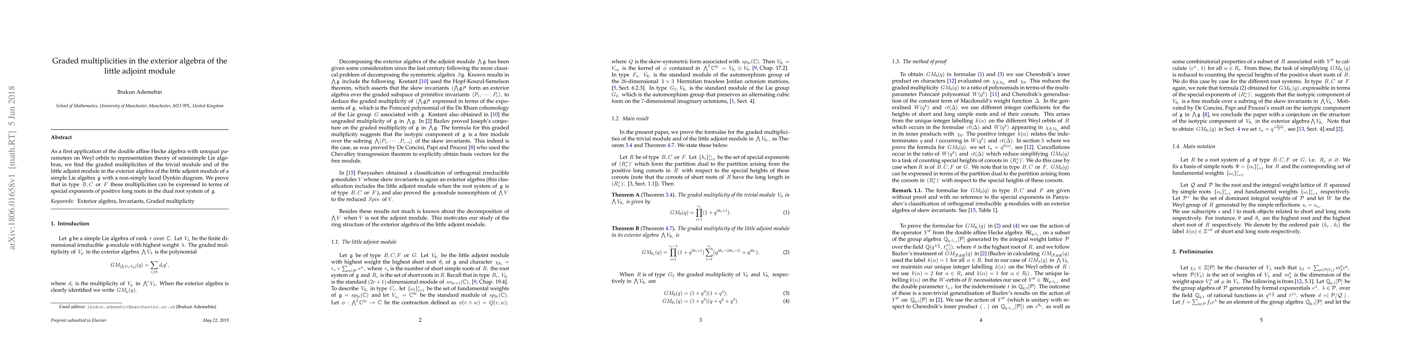 Research finds graded multiplicities of the trivial and little adjoint modules in the exterior algebra of their module over a simple Lie algebra, with expressions for certain types expressed through special exponents of positive long roots.
