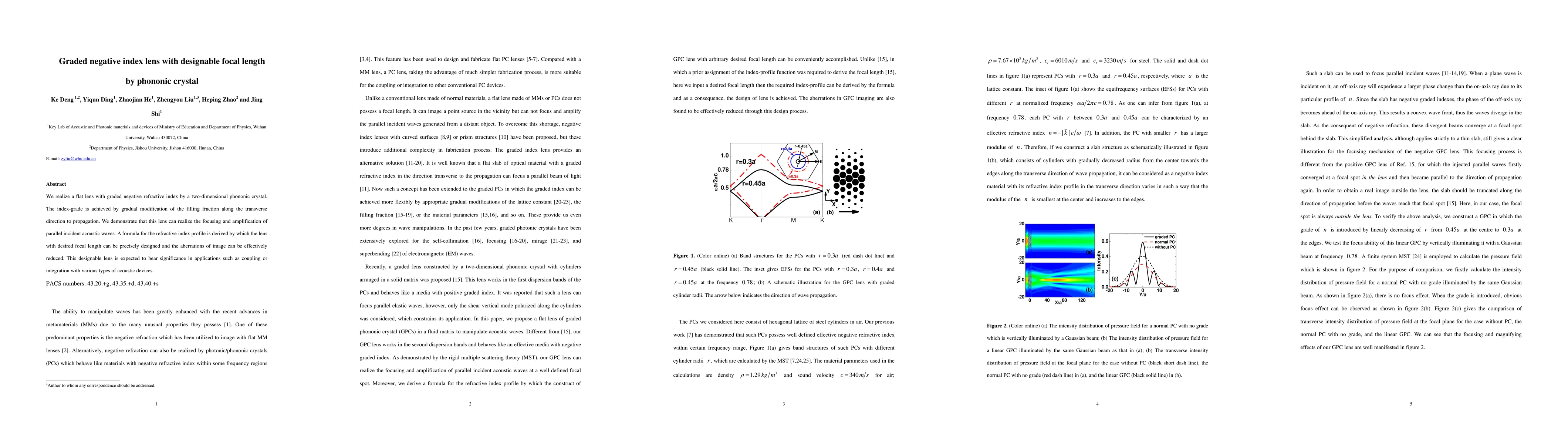 This paper presents a flat phononic crystal lens with a graded negative refractive index, enabling tunable focal length and improved focusing of acoustic waves. The design allows precise control over the focal length and reduces image aberrations, promising applications in acoustic devices.