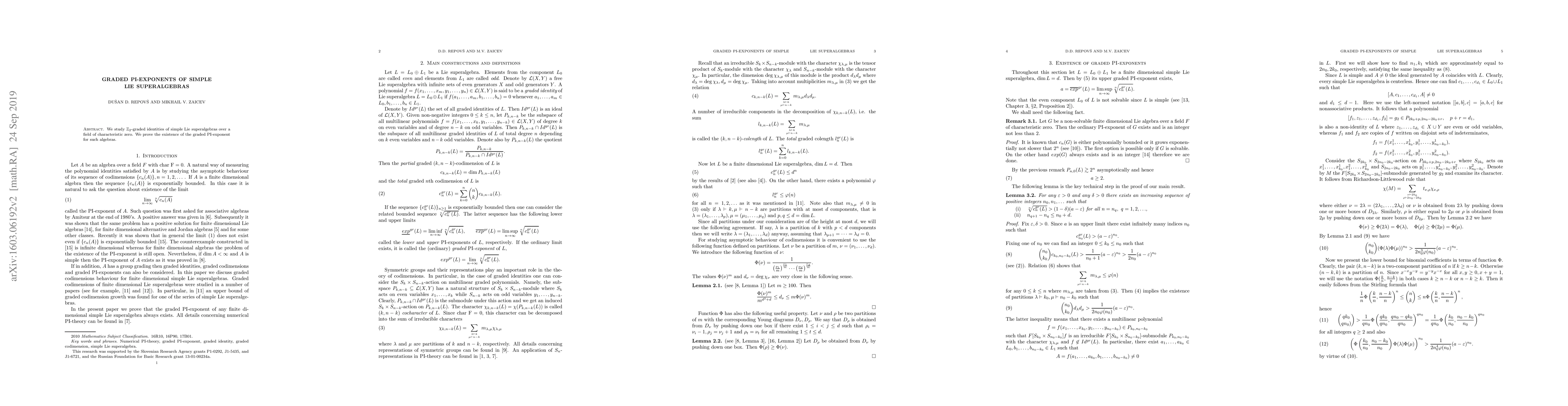 Summary: This paper investigates $\mathbb{Z}_2$-graded identities in simple Lie superalgebras over characteristic zero fields, proving the existence of a graded PI-exponent for these algebras.