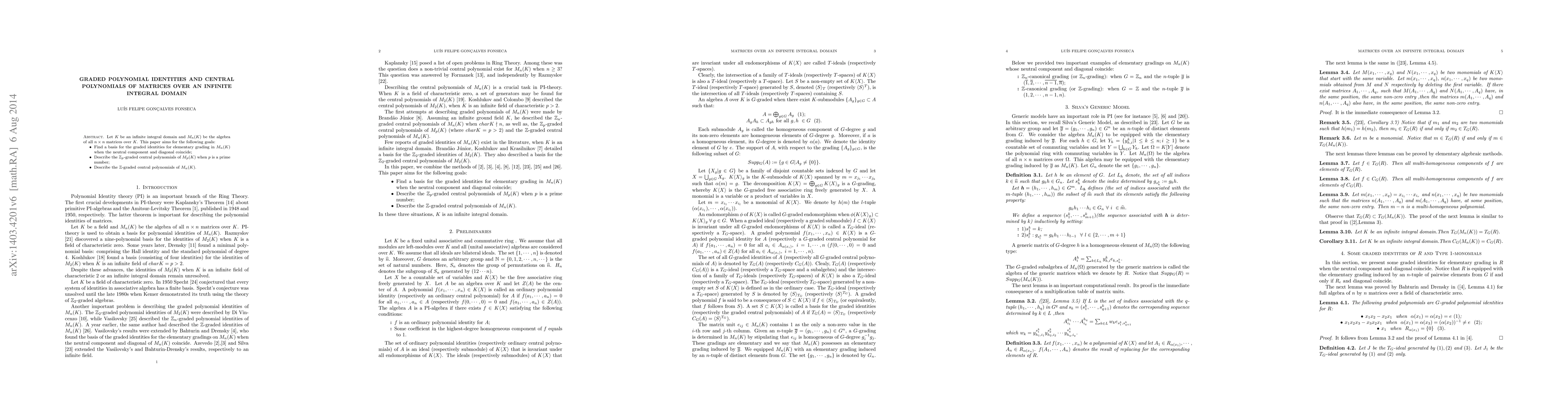This paper investigates graded polynomial identities and central polynomials in matrix algebras over infinite integral domains. It provides a basis for graded identities in $M_{n}(K)$ and describes $\mathbb{Z}_{p}$-graded central polynomials for $M_{p}(K)$ when $p$ is prime, as well as $\mathbb{Z}$-graded central polynomials for $M_{n}(K)$.