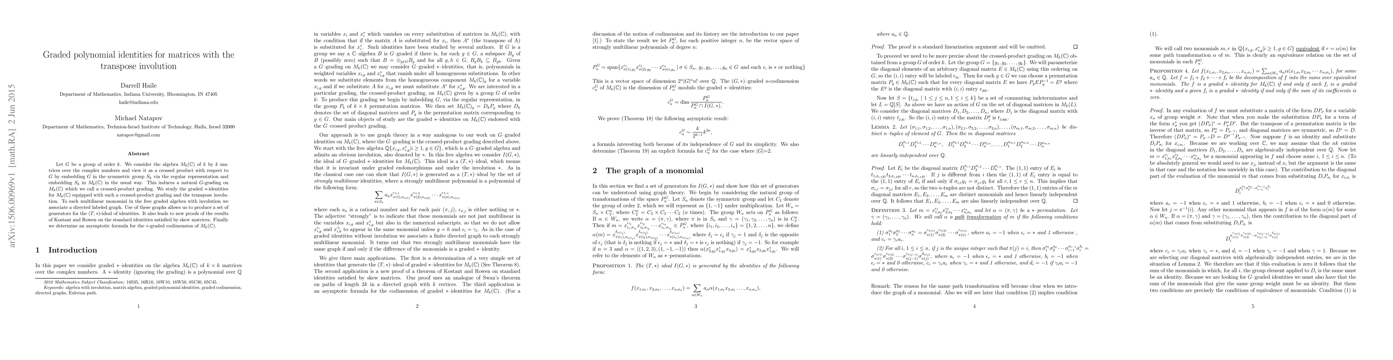 This paper investigates graded polynomial identities in the algebra of $k \times k$ matrices over $\mathbb{C}$, focusing on the crossed-product grading induced by a group $G$ and the transpose involution. It uses directed labeled graphs to generate the $(T,*)$-ideal of identities and provides new proofs for known results on skew matrices.
