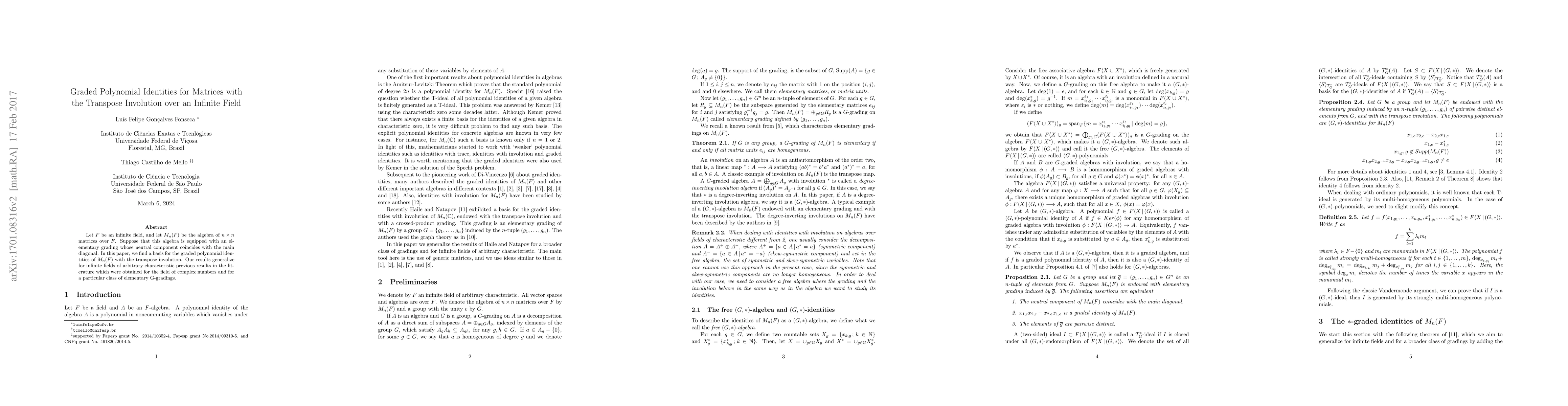 This paper establishes a basis for the graded polynomial identities of $n \times n$ matrices over an infinite field $F$ with a transpose involution under an elementary grading. The results extend previous findings for complex numbers and specific G-gradings to infinite fields of any characteristic.