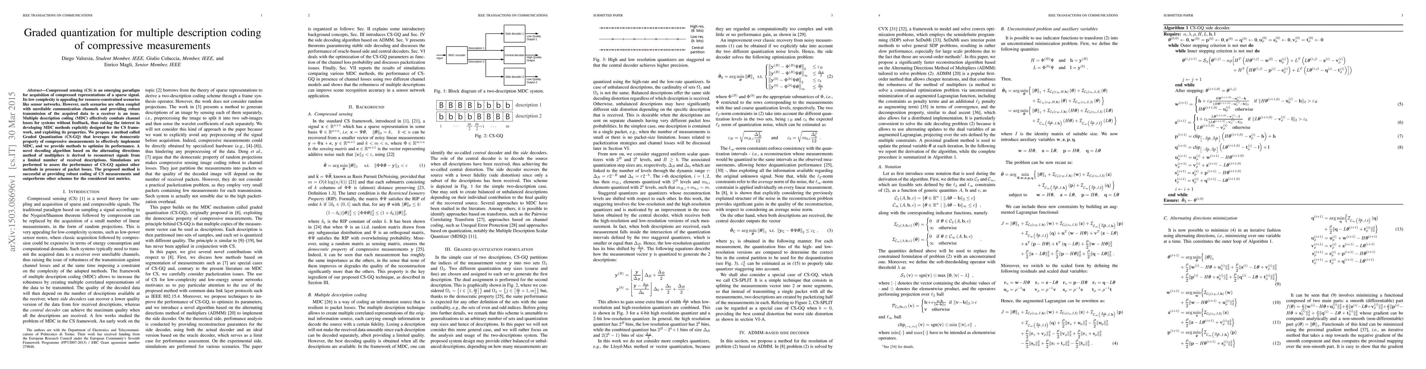 This paper proposes a Graded Quantization method (CS-GQ) for multiple description coding of compressive sensing measurements, leveraging the democratic property of compressive measurements to enhance robustness against packet losses. The method outperforms other schemes in simulations, demonstrating effective coding for resource-constrained scenarios with unreliable communication channels.