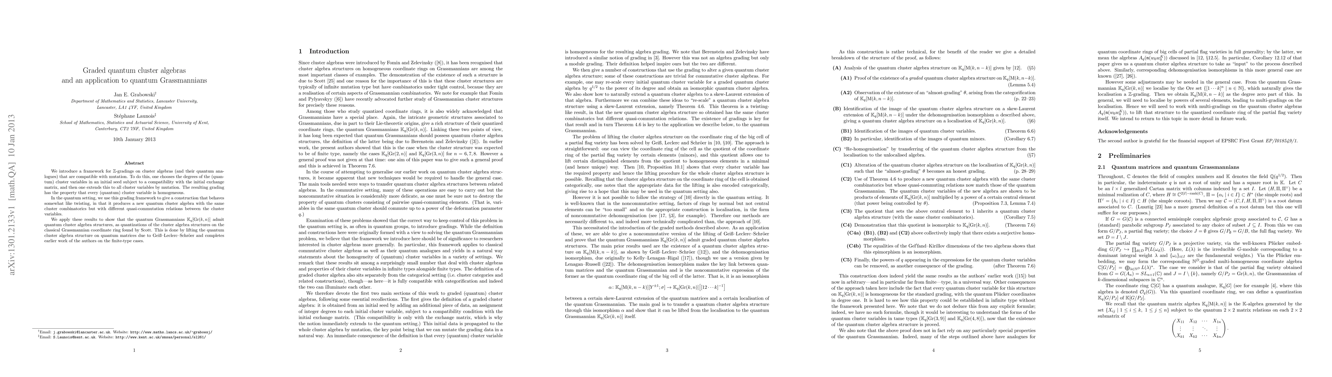 The paper introduces a framework for $\mathbb{Z}$-gradings on cluster algebras and their quantum analogues, extending the grading through mutation to maintain homogeneity. It applies this framework to demonstrate that quantum Grassmannians possess quantum cluster algebra structures, building on earlier work by the authors and the classical Grassmannian coordinate ring quantization.