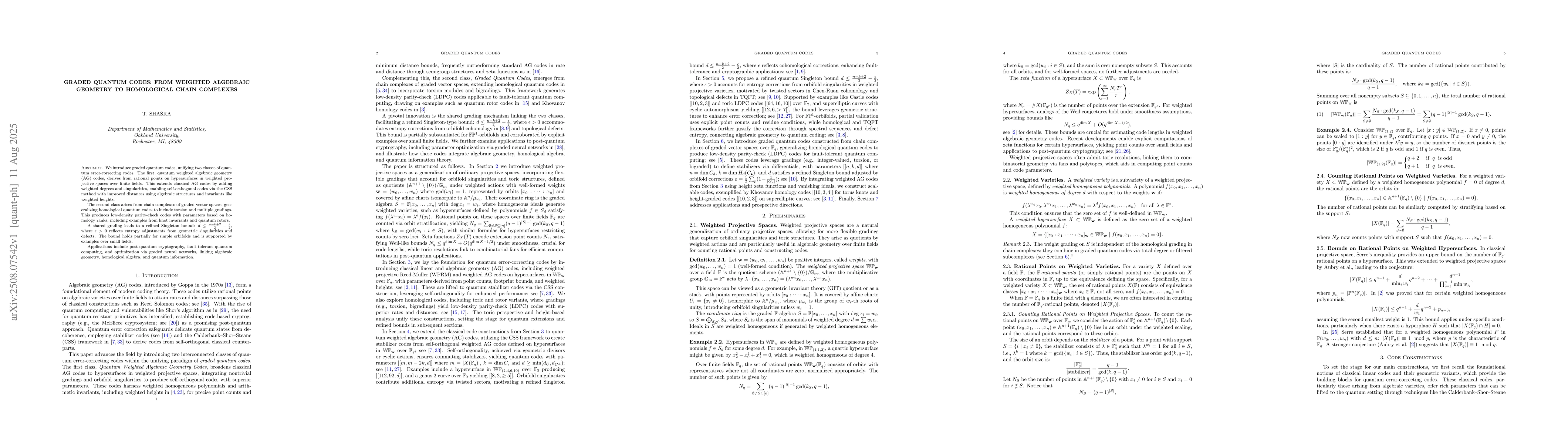 We introduce graded quantum codes, unifying two classes of quantum error-correcting codes. The first, quantum weighted algebraic geometry (AG) codes, derives from rational points on hypersurfaces in weighted projective spaces over finite fields. This extends classical AG codes by adding weighted degrees and singularities, enabling self-orthogonal codes via the CSS method with improved distances using algebraic structures and invariants like weighted heights.The second class arises from chain complexes of graded vector spaces, generalizing homological quantum codes to include torsion and multiple gradings. This produces low-density parity-check codes with parameters based on homology ranks, including examples from knot invariants and quantum rotors. A shared grading leads to a refined Singleton bound: $d \leq \frac{n - k + 2}{2} - \frac{\epsilon}{2}$, where $\epsilon > 0$ reflects entropy adjustments from geometric singularities and defects. The bound holds partially for simple orbifolds and is supported by examples over small fields. Applications include post-quantum cryptography, fault-tolerant quantum computing, and optimization via graded neural networks, linking algebraic geometry, homological algebra, and quantum information.