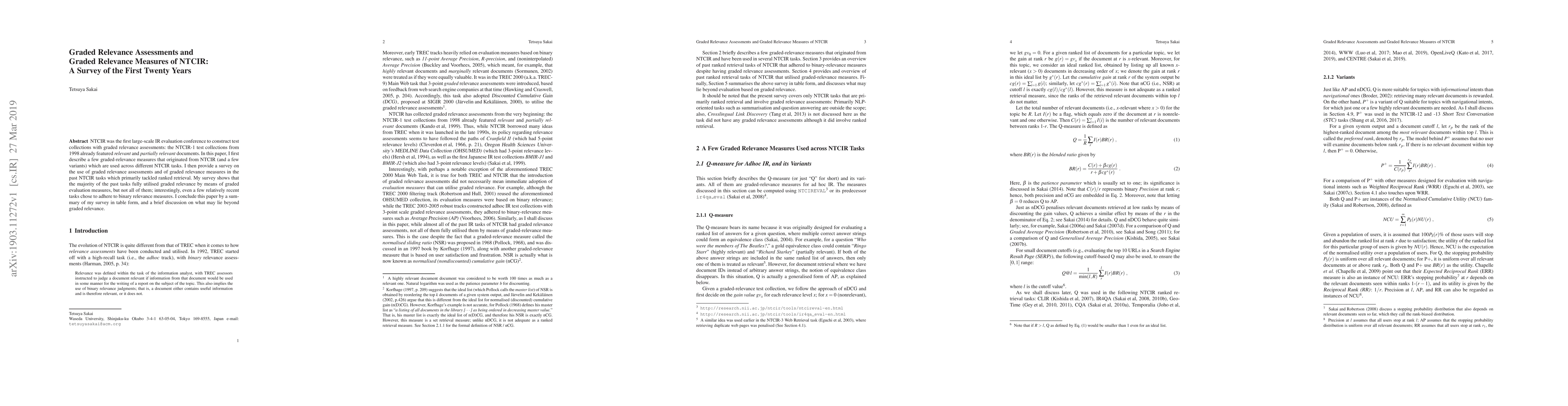 This paper provides a comprehensive survey of the first twenty years of NTCIR's use of graded relevance assessments and measures, highlighting their evolution and application in various IR tasks, and noting the shift from binary to graded relevance in evaluations. The paper concludes with a summary table and a discussion on future directions beyond graded relevance.