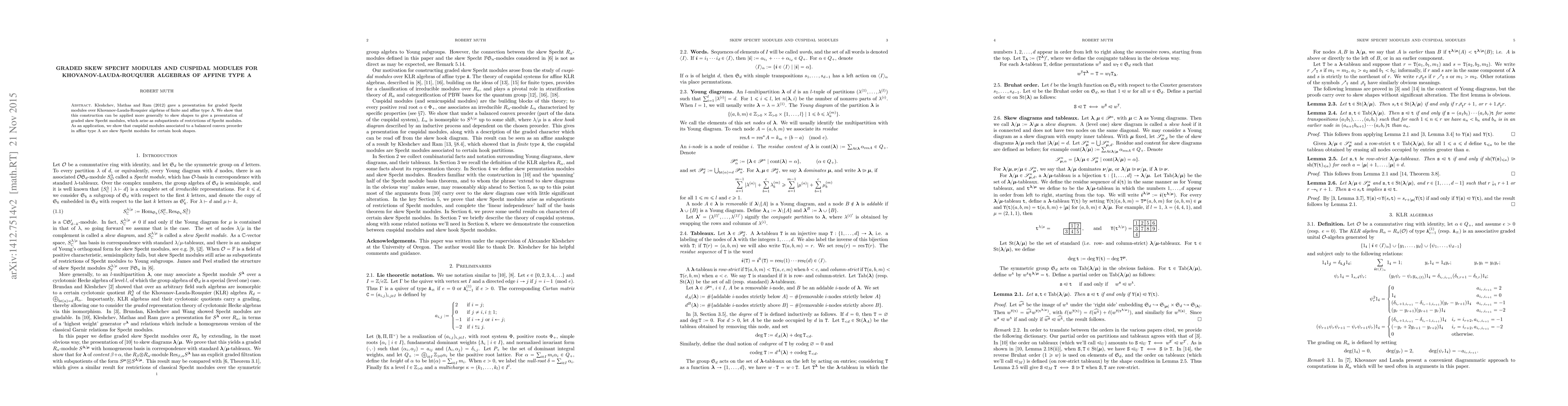 Kleshchev, Mathas and Ram (2012) gave a presentation for graded Specht modules over Khovanov-Lauda-Rouquier algebras of finite and affine type A. We show that this construction can be applied more generally to skew shapes to give a presentation of graded skew Specht modules, which arise as subquotients of restrictions of Specht modules. As an application, we show that cuspidal modules associated to a balanced convex preorder in affine type A are skew Specht modules for certain hook shapes.