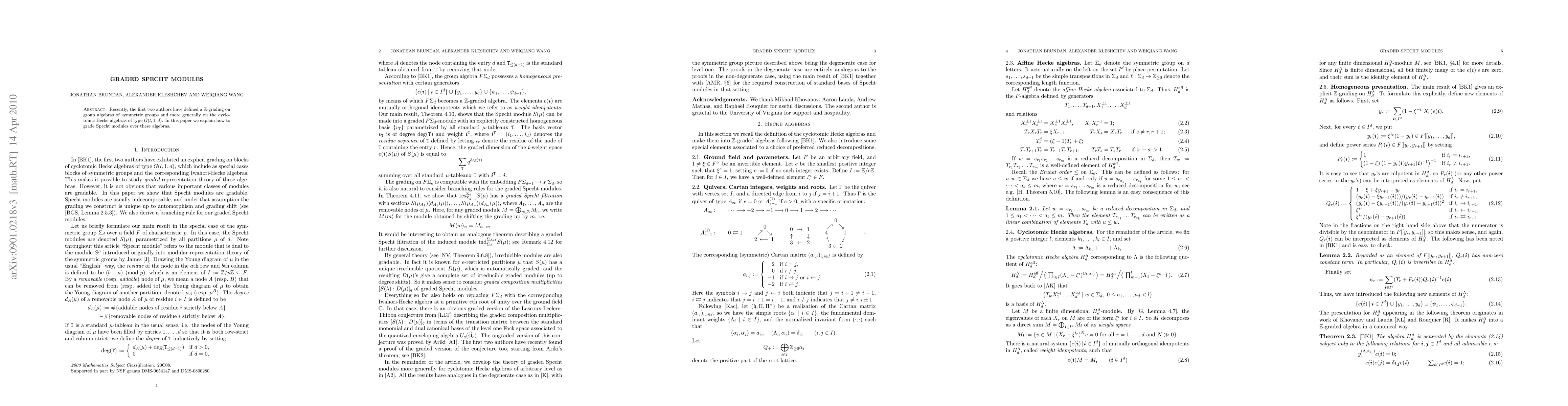 This paper details the methodology for assigning a Z-grading to Specht modules over graded group algebras of symmetric groups and cyclotomic Hecke algebras of type G(l,1,d), expanding on the Z-grading previously defined on these algebras.