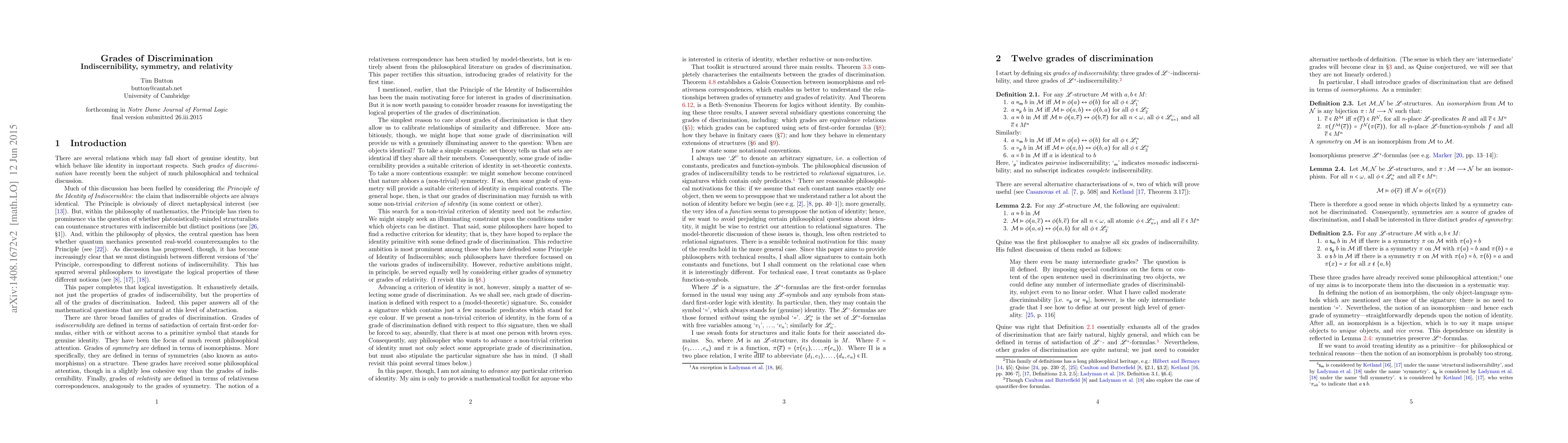 There are several relations which may fall short of genuine identity, but which behave like identity in important respects. Such grades of discrimination have recently been the subject of much philosophical and technical discussion. This paper aims to complete their technical investigation. Grades of indiscernibility are defined in terms of satisfaction of certain first-order formulas. Grades of symmetry are defined in terms of symmetries on a structure. Both of these families of grades of discrimination have been studied in some detail. However, this paper also introduces grades of relativity, defined in terms of relativeness correspondences. This paper explores the relationships between all the grades of discrimination, exhaustively answering several natural questions that have so far received only partial answers. It also establishes which grades can be captured in terms of satisfaction of object-language formulas, and draws connections with definability theory.
