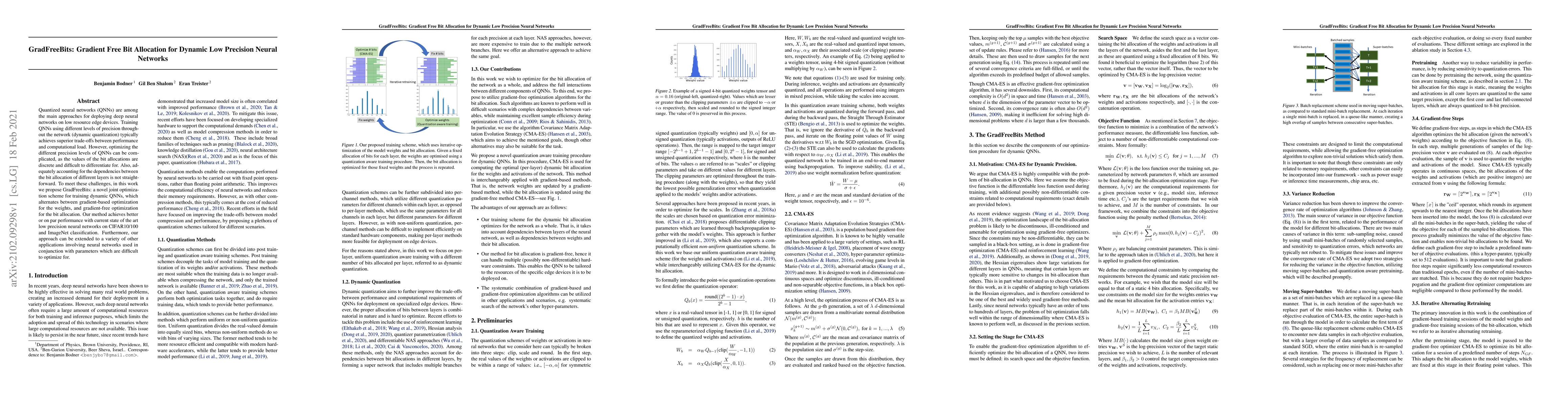 GradFreeBits combines gradient-based quantization-aware training for weights with gradient-free optimization for bit allocation, based on CMA-ES, to optimize dynamic QNNs.