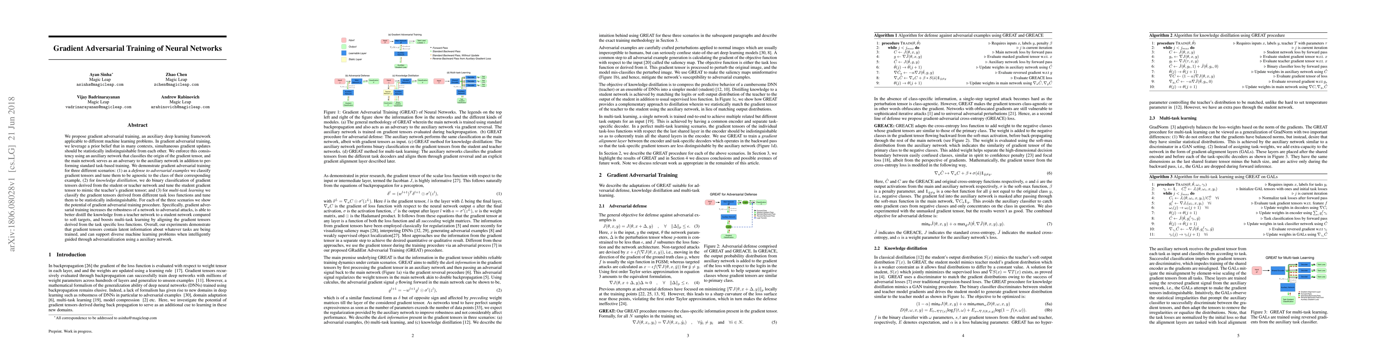 Gradient adversarial training enhances neural networks by enforcing consistency in gradient updates through an auxiliary network that classifies gradient tensors. This method improves robustness against adversarial examples, knowledge distillation, and multi-task learning by aligning gradient tensors to be statistically indistinguishable.