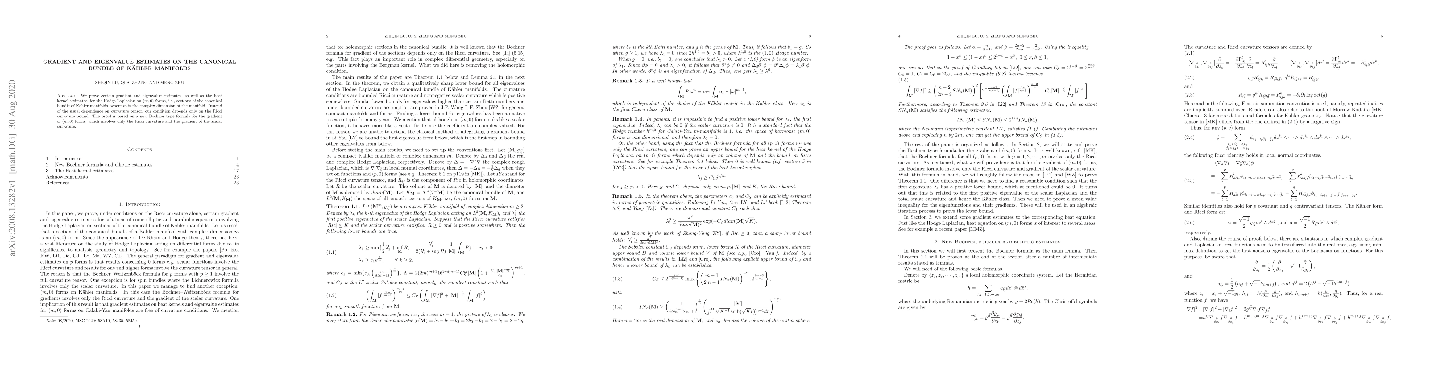 We prove certain gradient and eigenvalue estimates, as well as the heat kernel estimates, for the Hodge Laplacian on $(m,0)$ forms, i.e., sections of the canonical bundle of K\"ahler manifolds, where $m$ is the complex dimension of the manifold. Instead of the usual dependence on curvature tensor, our condition depends only on the Ricci curvature bound. The proof is based on a new Bochner type formula for the gradient of $(m, 0)$ forms, which involves only the Ricci curvature and the gradient of the scalar curvature.