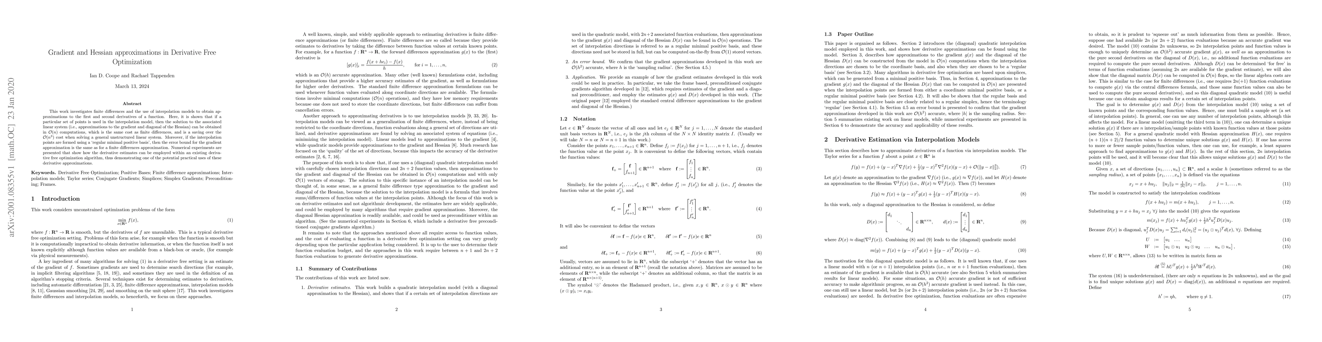 This paper explores the use of interpolation models for gradient and Hessian approximations in derivative-free optimization, achieving $\mathcal{O}(n)$ computational cost. It demonstrates that using a regular minimal positive basis for interpolation points maintains the accuracy of gradient approximations comparable to finite differences.