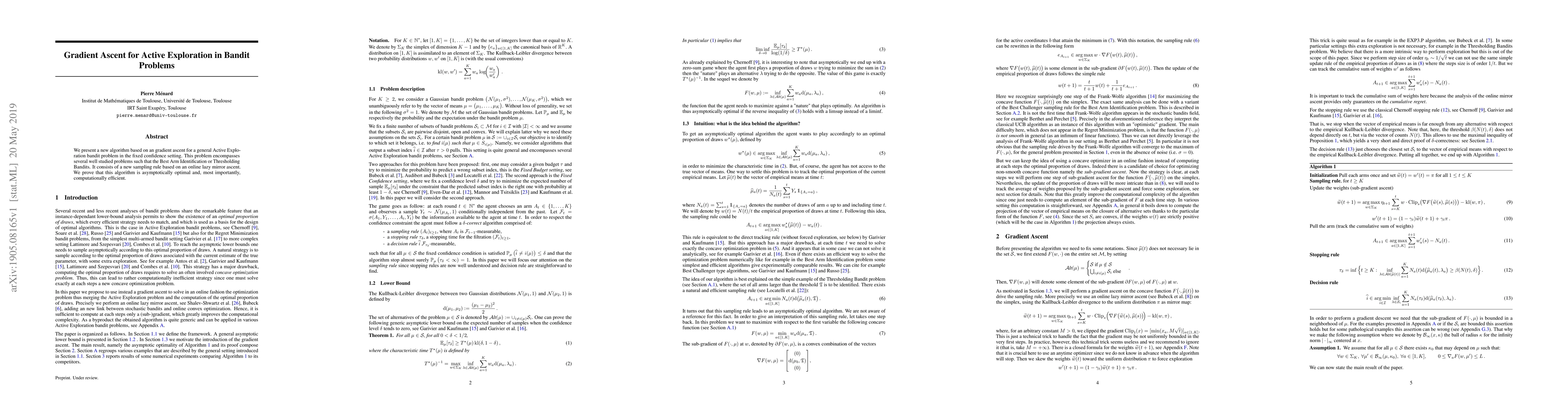 This paper introduces a gradient ascent-based algorithm for active exploration in bandit problems, demonstrating its asymptotic optimality and computational efficiency through an online lazy mirror ascent sampling rule. The method is shown to be effective for various well-studied bandit problems like Best Arm Identification.