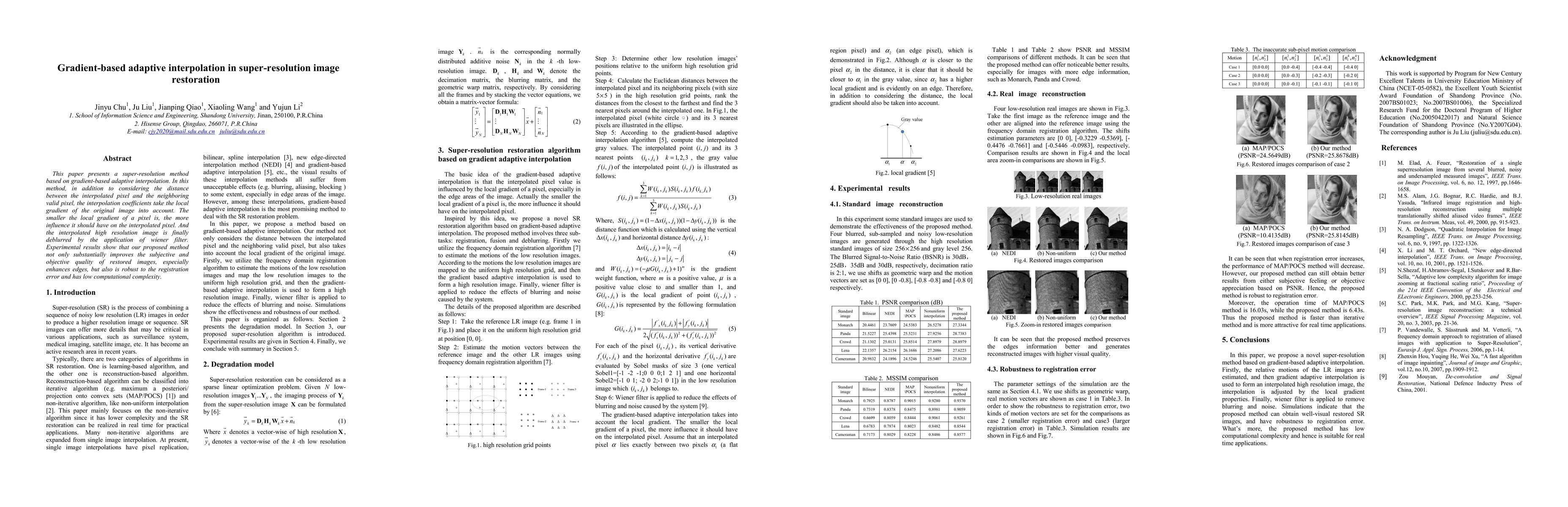 This paper proposes a super-resolution method using gradient-based adaptive interpolation that enhances image restoration by considering local gradients, improving edge quality and robustness. The method also employs a Wiener filter for deblurring and demonstrates low computational complexity.