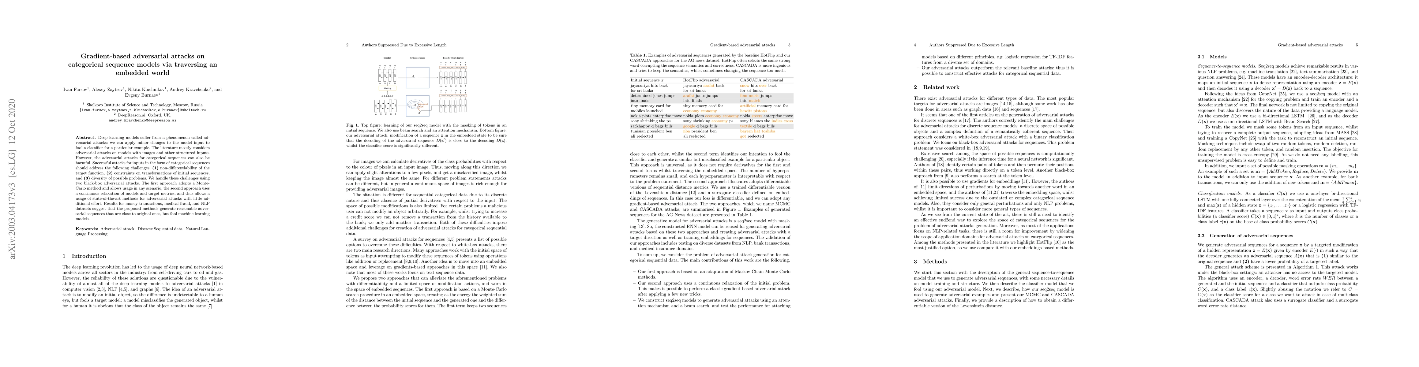 Deep learning models suffer from a phenomenon called adversarial attacks: we can apply minor changes to the model input to fool a classifier for a particular example. The literature mostly considers adversarial attacks on models with images and other structured inputs. However, the adversarial attacks for categorical sequences can also be harmful. Successful attacks for inputs in the form of categorical sequences should address the following challenges: (1) non-differentiability of the target function, (2) constraints on transformations of initial sequences, and (3) diversity of possible problems. We handle these challenges using two black-box adversarial attacks. The first approach adopts a Monte-Carlo method and allows usage in any scenario, the second approach uses a continuous relaxation of models and target metrics, and thus allows usage of state-of-the-art methods for adversarial attacks with little additional effort. Results for money transactions, medical fraud, and NLP datasets suggest that proposed methods generate reasonable adversarial sequences that are close to original ones but fool machine learning models.