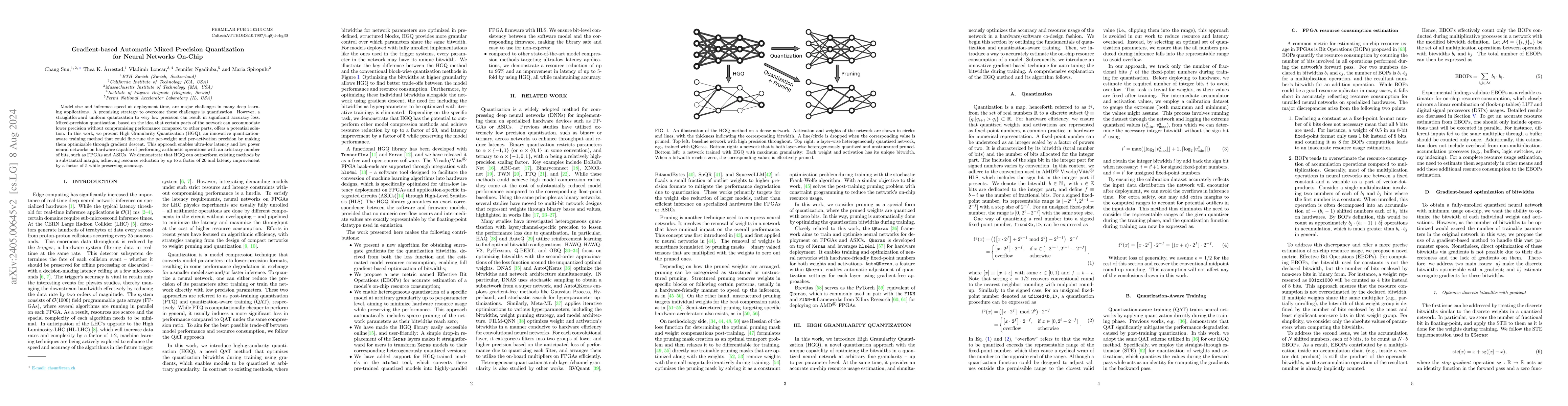 This research proposes High Granularity Quantization (HGQ), a gradient-based automatic per-weight mixed precision quantization method for neural networks to be deployed on FPGAs. HGQ achieves significant reductions in model size and inference latency while maintaining accuracy, outperforming existing methods by up to a factor of 20 in resource reduction and 5 in latency improvement.