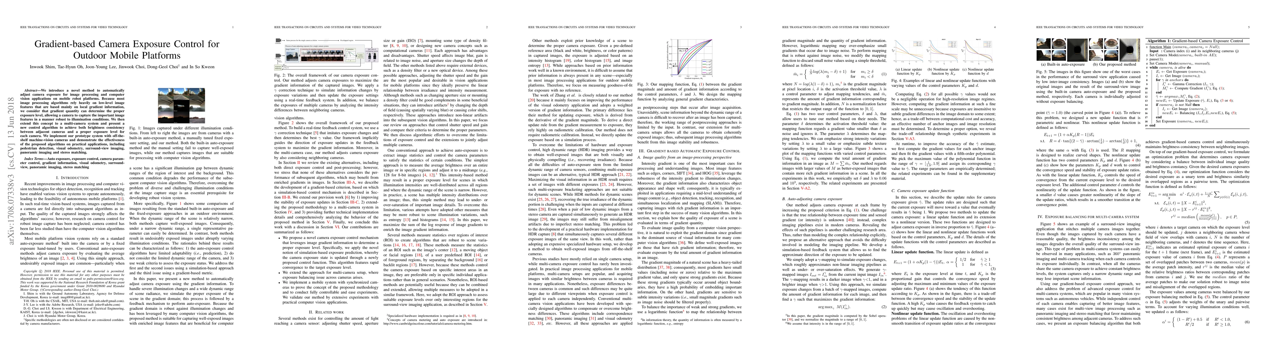 This paper proposes a gradient-based method for automatic camera exposure control on mobile robots, ensuring optimal image feature capture under varying illumination. It extends the concept to multi-camera systems for brightness consistency and demonstrates effectiveness in applications like pedestrian detection and panoramic imaging.