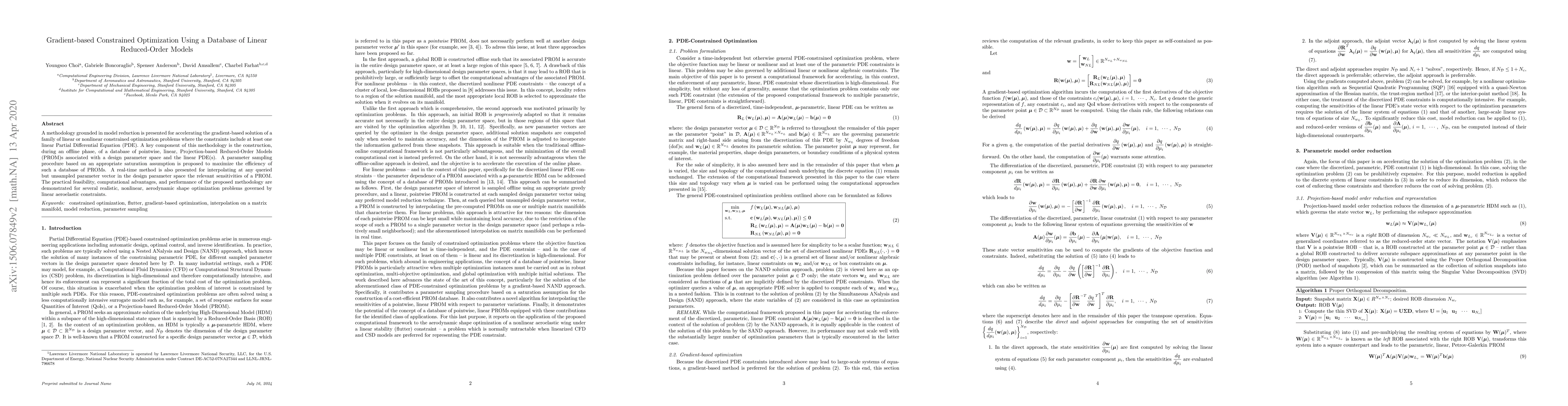 This paper proposes a model reduction methodology to expedite gradient-based optimization of constrained problems involving linear PDEs, using a database of linear Projection-based Reduced-Order Models (PROMs). The methodology includes an offline phase for constructing PROMs and a real-time interpolation method for queried parameters, demonstrating efficiency in nonlinear aerodynamic shape optimization.