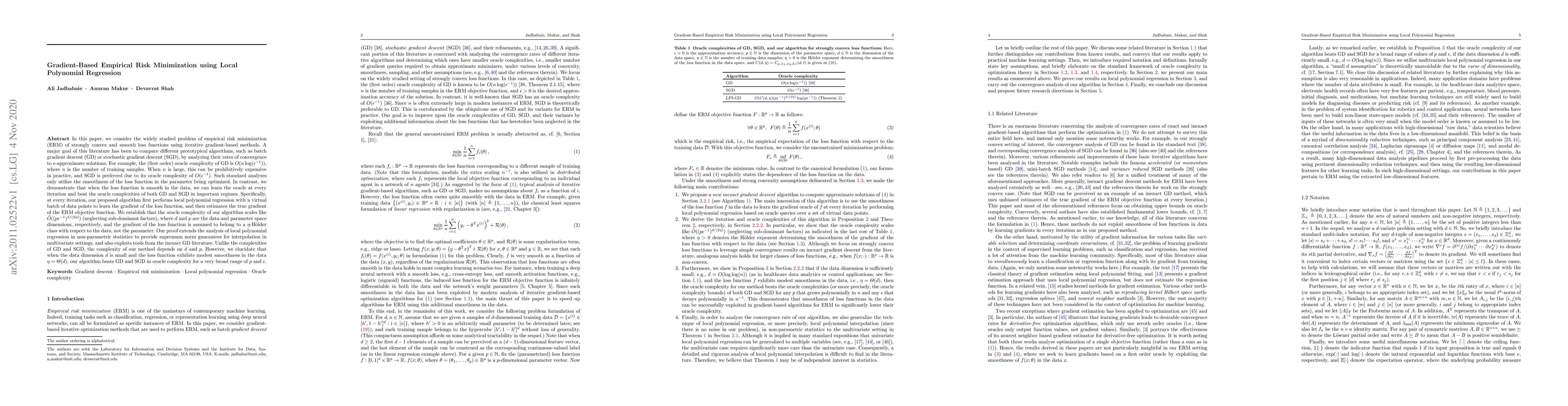This paper proposes a gradient-based empirical risk minimization algorithm that leverages local polynomial regression to outperform traditional gradient descent and stochastic gradient descent in terms of oracle complexity, especially when the loss function is smooth in the data. The algorithm's complexity scales favorably with data and parameter space dimensions under certain conditions.