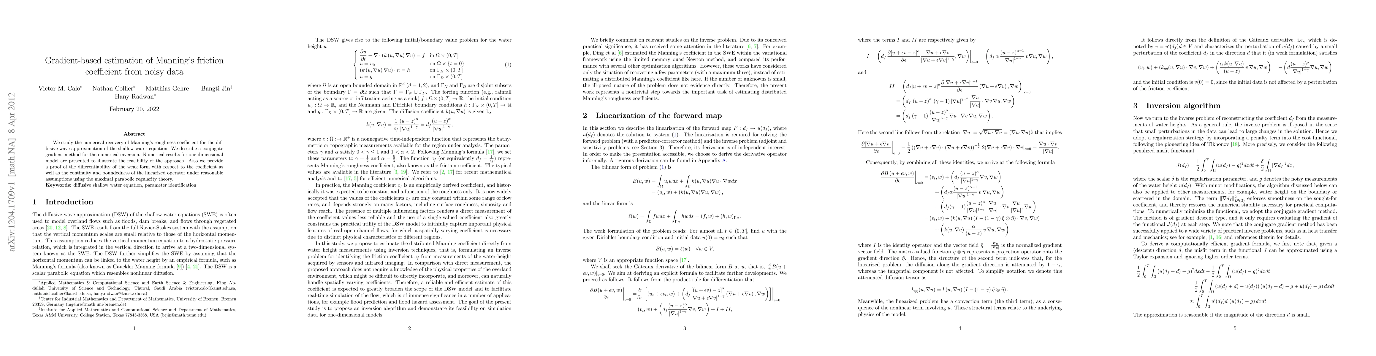 This paper proposes a conjugate gradient method for estimating Manning's friction coefficient from noisy data in the context of the shallow water equation. It demonstrates the method's feasibility through numerical results and proves the differentiability and boundedness of the linearized operator using maximal parabolic regularity theory.