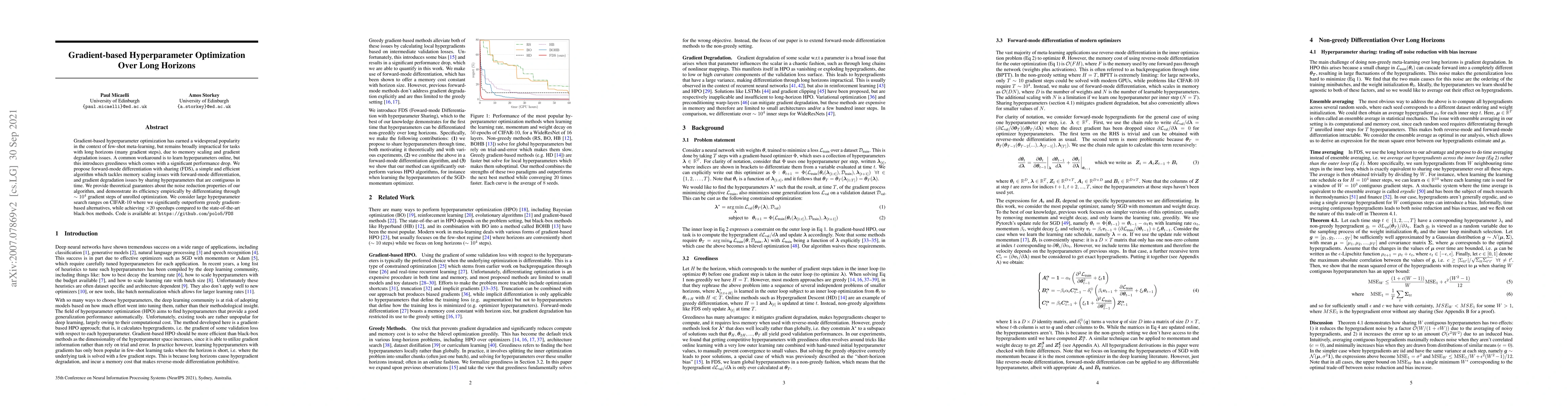 This paper proposes forward-mode differentiation with sharing (FDS) to optimize hyperparameters over long horizons, addressing memory scaling and gradient degradation issues. The method achieves significant performance improvements and speedups over greedy alternatives, demonstrated through extensive experiments on CIFAR-10.