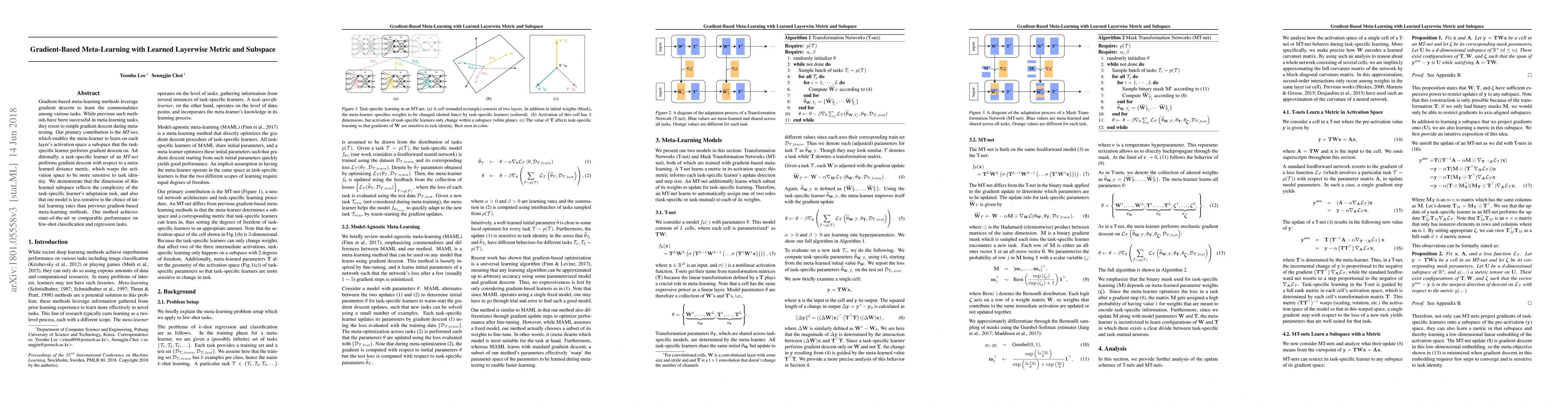 This paper introduces MT-net, a gradient-based meta-learning method that learns layerwise subspaces and a task-specific metric to enhance task adaptation. It achieves state-of-the-art performance on few-shot classification and regression tasks, demonstrating improved sensitivity to task identity and reduced sensitivity to initial learning rates.