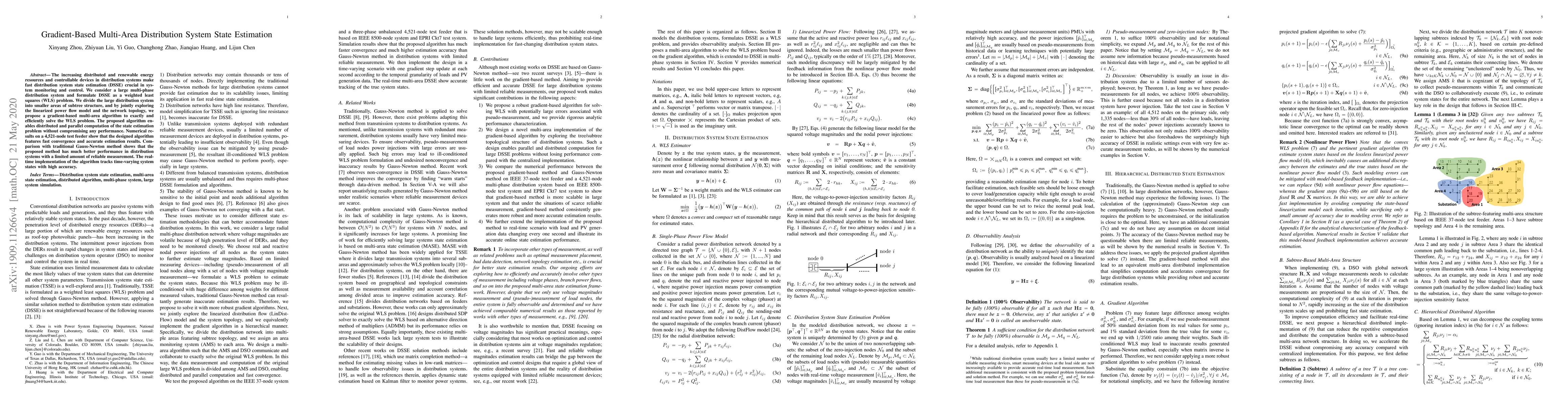 This paper proposes a gradient-based multi-area algorithm for efficient and accurate state estimation in large distribution systems, leveraging a weighted least squares approach and parallel computation. The method shows superior performance compared to traditional methods, especially in systems with limited reliable measurements.