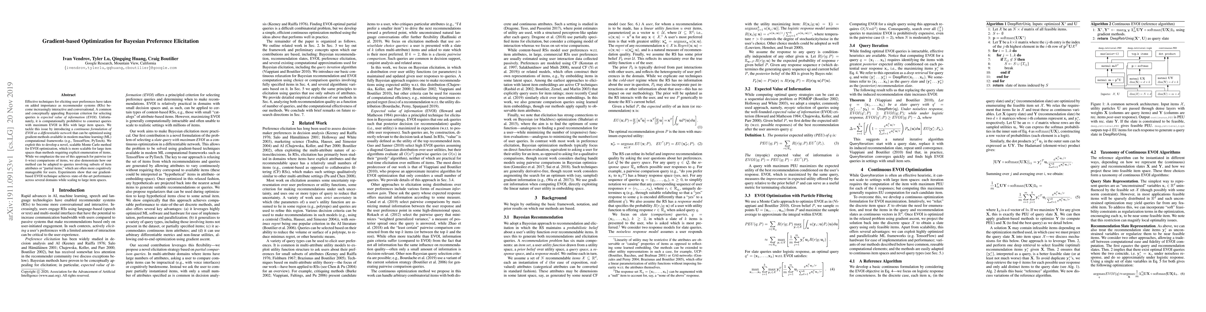 This paper presents a gradient-based optimization method for Bayesian preference elicitation in recommender systems, transforming the computationally intensive expected value of information (EVOI) into a differentiable network. The proposed scalable Monte Carlo method outperforms traditional methods in large item spaces, demonstrating state-of-the-art performance across various domains.