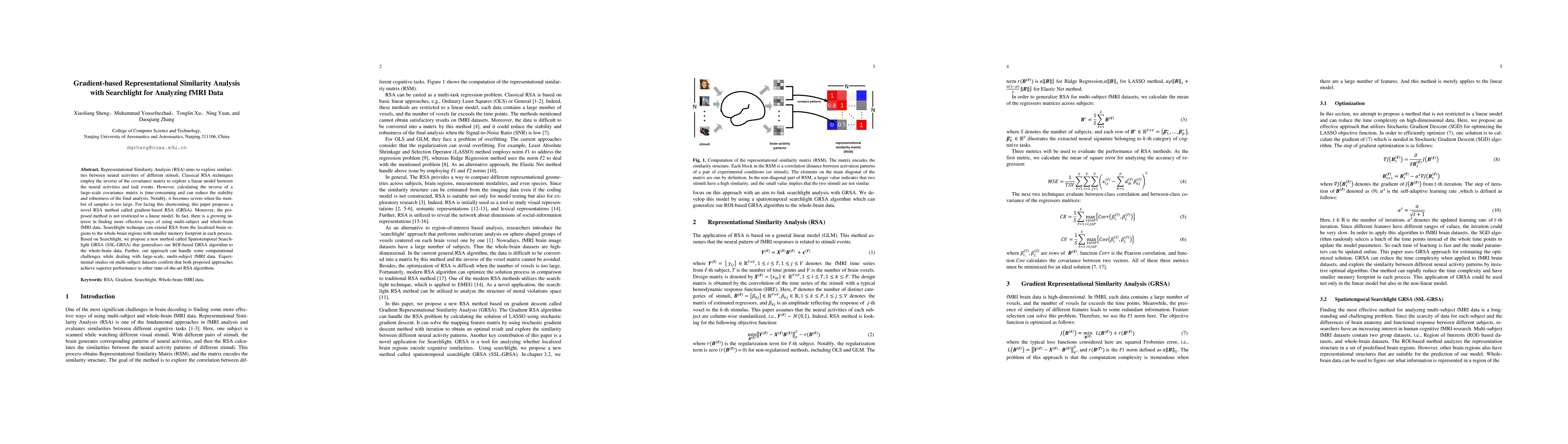 This paper introduces a novel gradient-based RSA (GRSA) method to improve the analysis of fMRI data, addressing computational challenges associated with large-scale covariance matrices. It further proposes a Spatiotemporal Searchlight GRSA (SSL-GRSA) to extend RSA to whole-brain data, demonstrating superior performance over existing algorithms in multi-subject datasets.