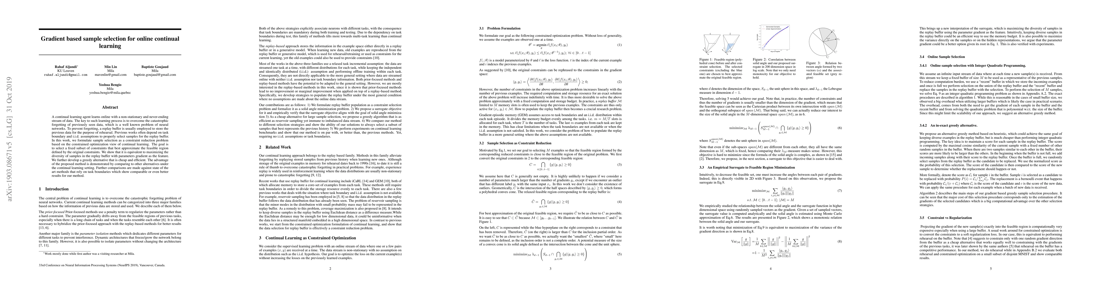 A continual learning agent learns online with a non-stationary and never-ending stream of data. The key to such learning process is to overcome the catastrophic forgetting of previously seen data, which is a well known problem of neural networks. To prevent forgetting, a replay buffer is usually employed to store the previous data for the purpose of rehearsal. Previous works often depend on task boundary and i.i.d. assumptions to properly select samples for the replay buffer. In this work, we formulate sample selection as a constraint reduction problem based on the constrained optimization view of continual learning. The goal is to select a fixed subset of constraints that best approximate the feasible region defined by the original constraints. We show that it is equivalent to maximizing the diversity of samples in the replay buffer with parameters gradient as the feature. We further develop a greedy alternative that is cheap and efficient. The advantage of the proposed method is demonstrated by comparing to other alternatives under the continual learning setting. Further comparisons are made against state of the art methods that rely on task boundaries which show comparable or even better results for our method.