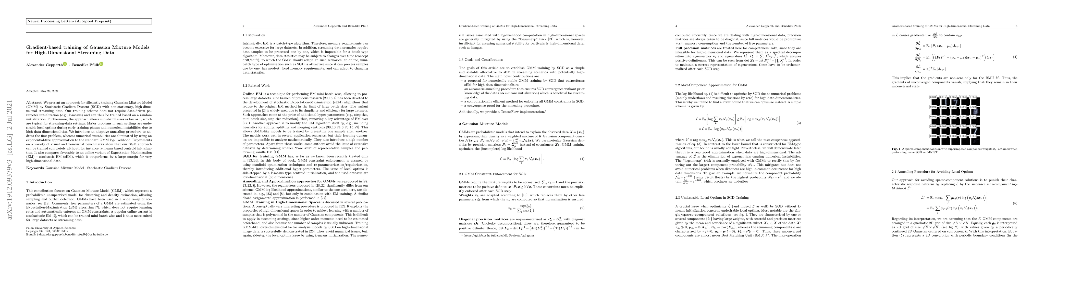 This paper proposes a gradient-based training method for Gaussian Mixture Models (GMM) using Stochastic Gradient Descent (SGD) for high-dimensional streaming data, eliminating the need for k-means initialization. It addresses local optima and numerical instability through adaptive annealing and an exponential-free log-likelihood approximation, outperforming online Expectation-Maximization (EM) for high-dimensional data.