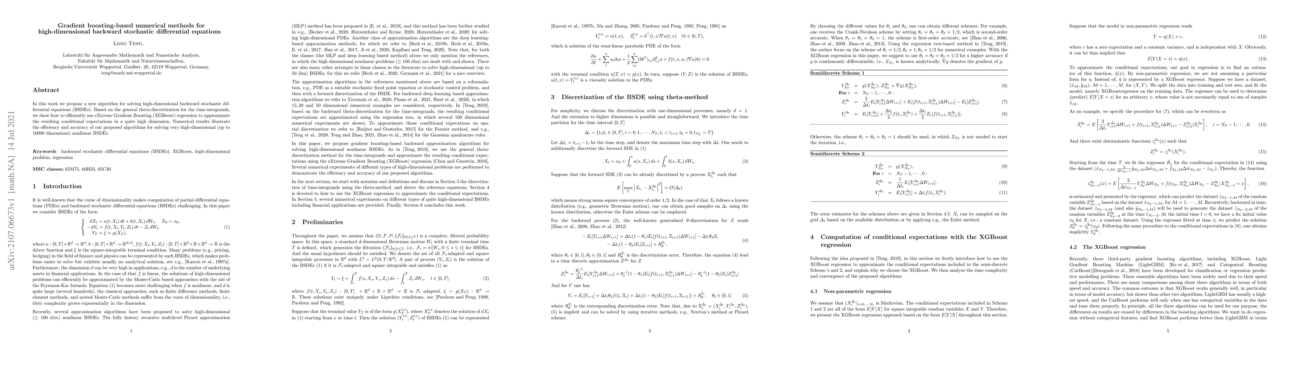 This paper proposes a novel algorithm using eXtreme Gradient Boosting (XGBoost) regression to solve high-dimensional backward stochastic differential equations (BSDEs). The method efficiently approximates conditional expectations in high dimensions, demonstrating efficiency and accuracy through numerical results for up to 10,000 dimensions.