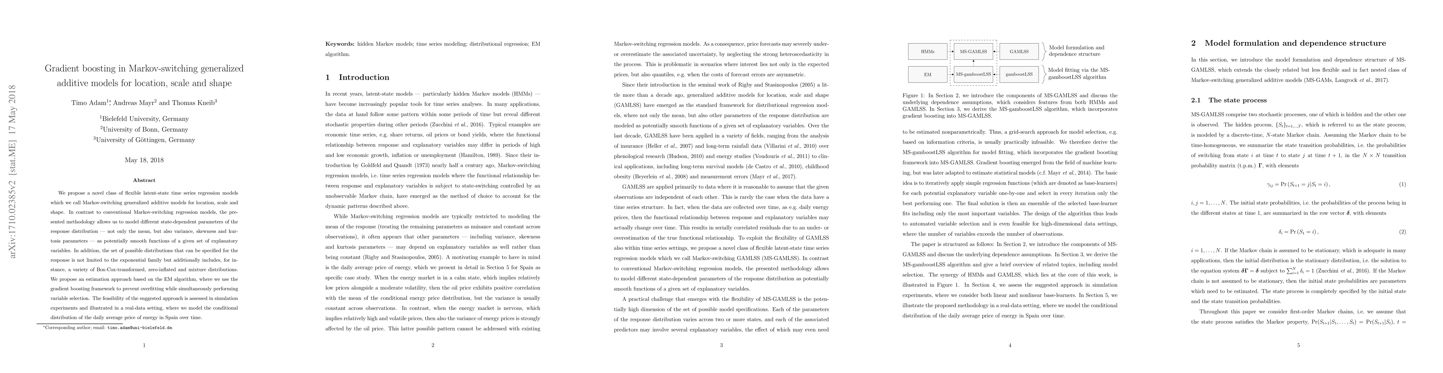 This paper introduces Markov-switching generalized additive models for location, scale, and shape, allowing state-dependent modeling of mean, variance, skewness, and kurtosis. The gradient boosting framework within an EM algorithm is used for estimation and variable selection, demonstrated through simulations and a real-data application on energy prices in Spain.
