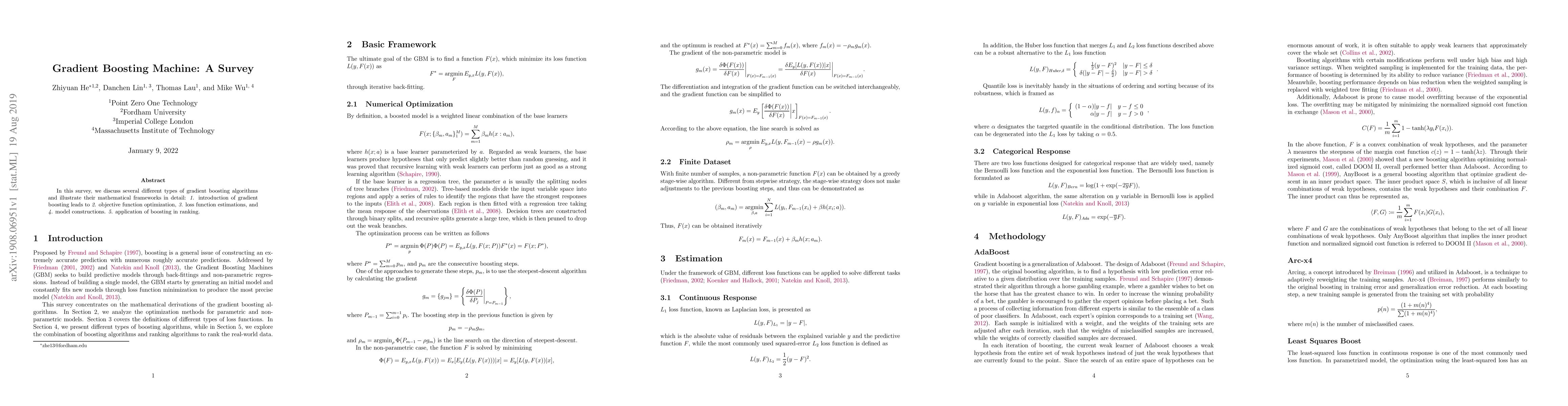 In this survey, we discuss several different types of gradient boosting algorithms and illustrate their mathematical frameworks in detail: 1. introduction of gradient boosting leads to 2. objective function optimization, 3. loss function estimations, and 4. model constructions. 5. application of boosting in ranking.