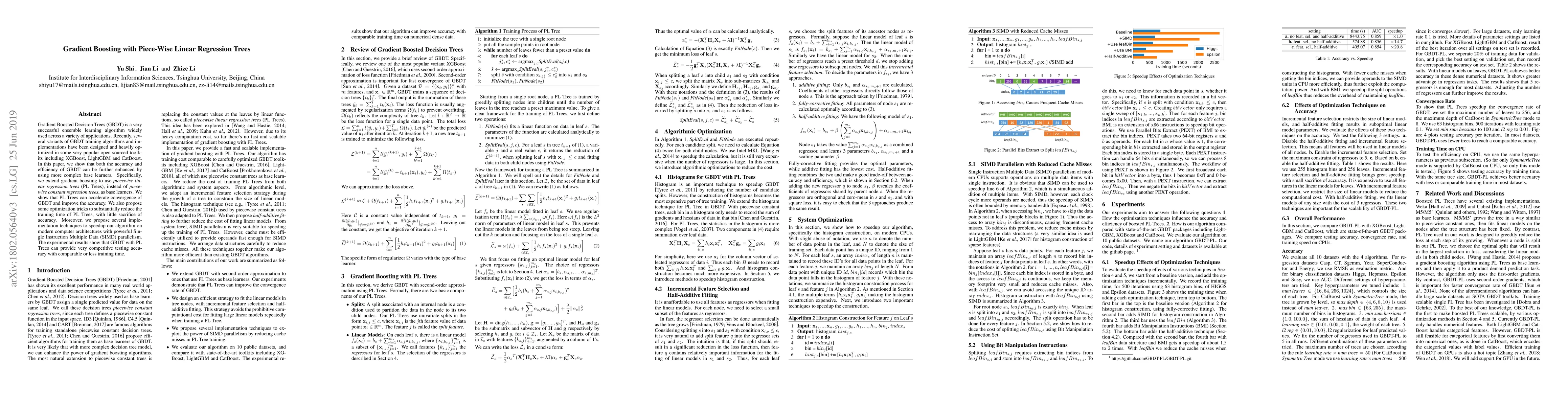 This paper proposes using piecewise linear regression trees (PL Trees) as base learners in Gradient Boosted Decision Trees (GBDT) to enhance both accuracy and efficiency. The PL Trees accelerate convergence and improve accuracy while optimization tricks reduce training time, and implementation techniques leverage SIMD parallelism for faster execution.