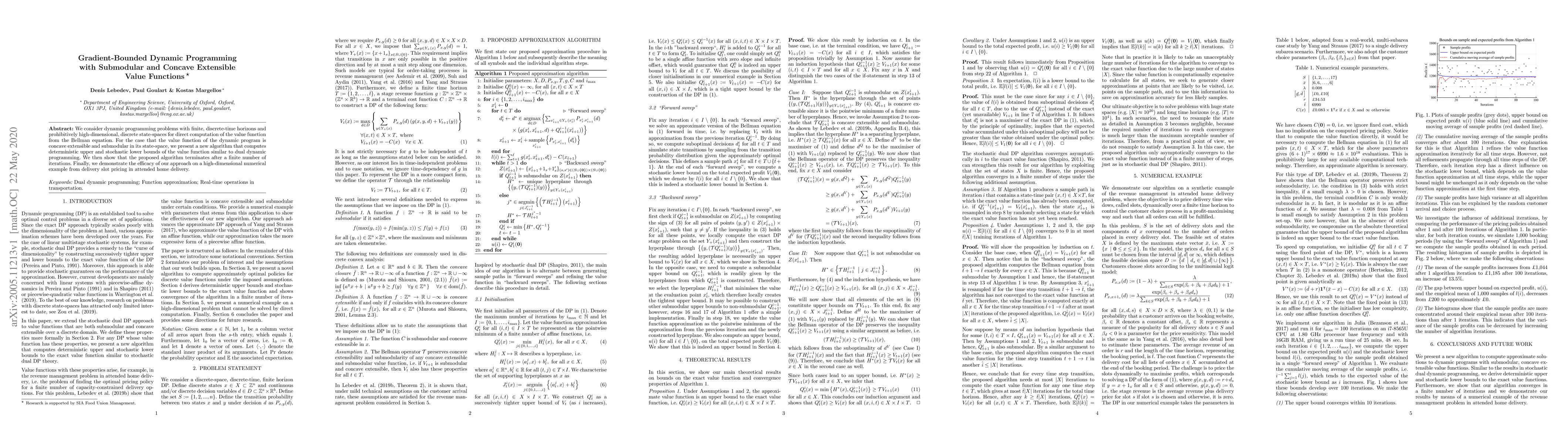 This paper introduces a gradient-bounded dynamic programming algorithm for high-dimensional state-space problems where the value function is concave, extensible, and submodular. The proposed algorithm computes deterministic upper and stochastic lower bounds, and it is shown to terminate in a finite number of iterations, demonstrated through a delivery slot pricing example.