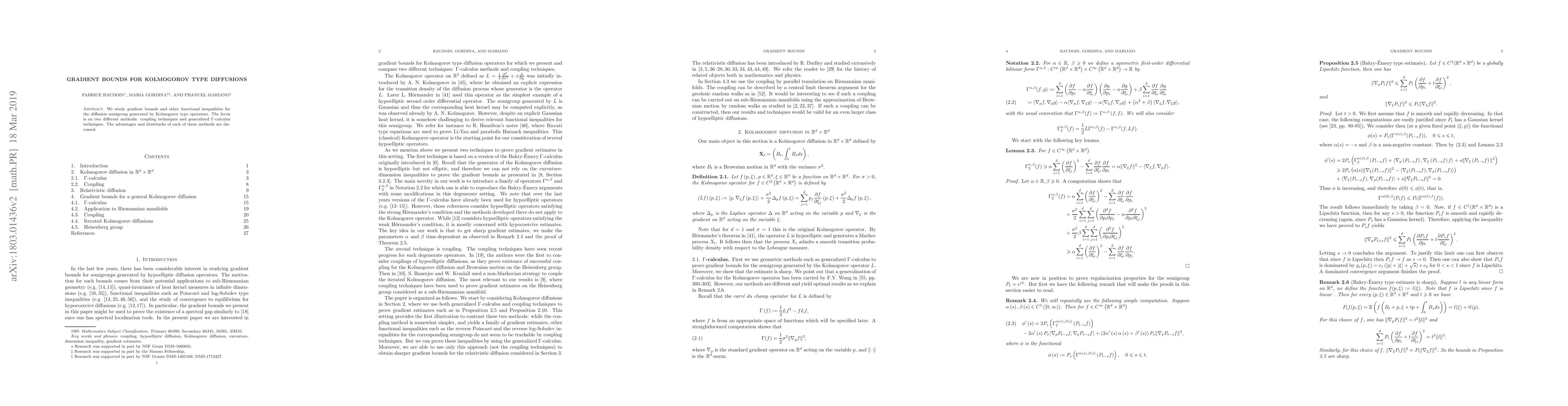 We study gradient bounds and other functional inequalities for the diffusion semigroup generated by Kolmogorov type operators. The focus is on two different methods: coupling techniques and generalized $\Gamma$-calculus techniques. The advantages and drawbacks of each of these methods are discussed.
