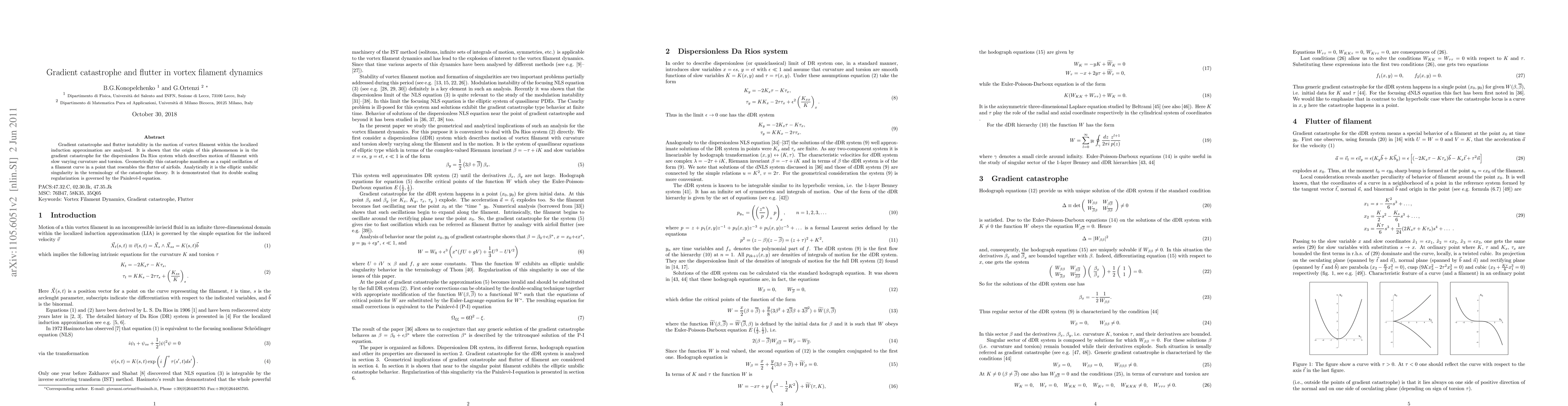 Gradient catastrophe and flutter instability in the motion of vortex filament within the localized induction approximation are analyzed. It is shown that the origin if this phenomenon is in the gradient catastrophe for the dispersionless Da Rios system which describes motion of filament with slow varying curvature and torsion. Geometrically this catastrophe manifests as a rapid oscillation of a filament curve in a point that resembles the flutter of airfoils. Analytically it is the elliptic umbilic singularity in the terminology of the catastrophe theory. It is demonstrated that its double scaling regularization is governed by the Painlev\'e-I equation.