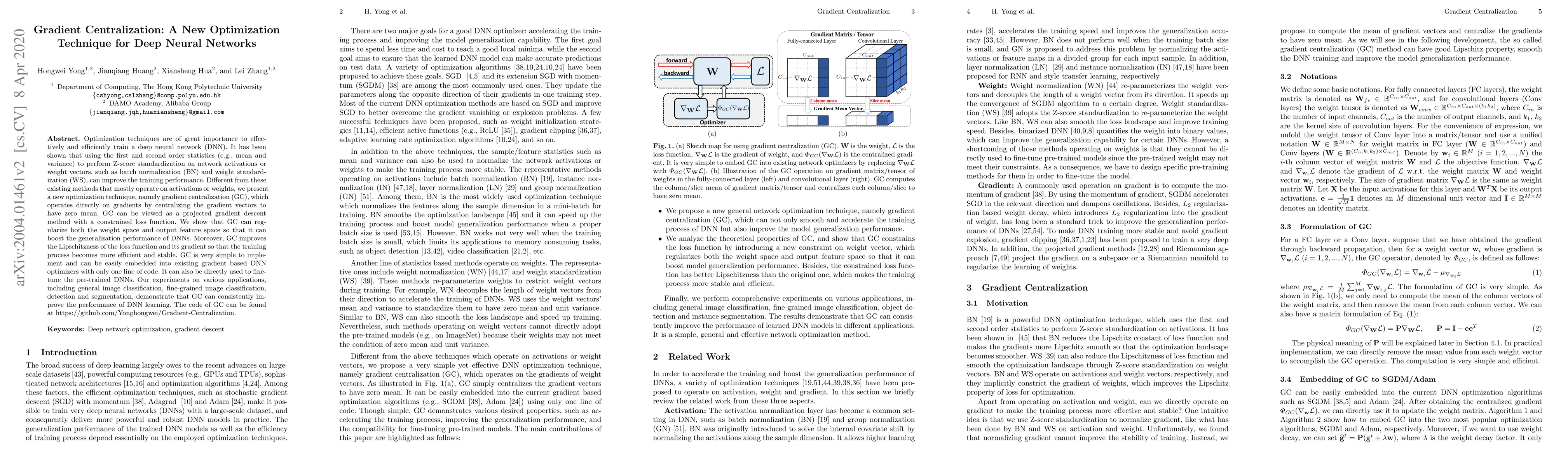 Gradient centralization (GC) is a new optimization technique that centralizes gradient vectors to zero mean, enhancing both training efficiency and stability of deep neural networks. This method improves generalization performance and can be easily integrated into existing optimizers with minimal code changes.