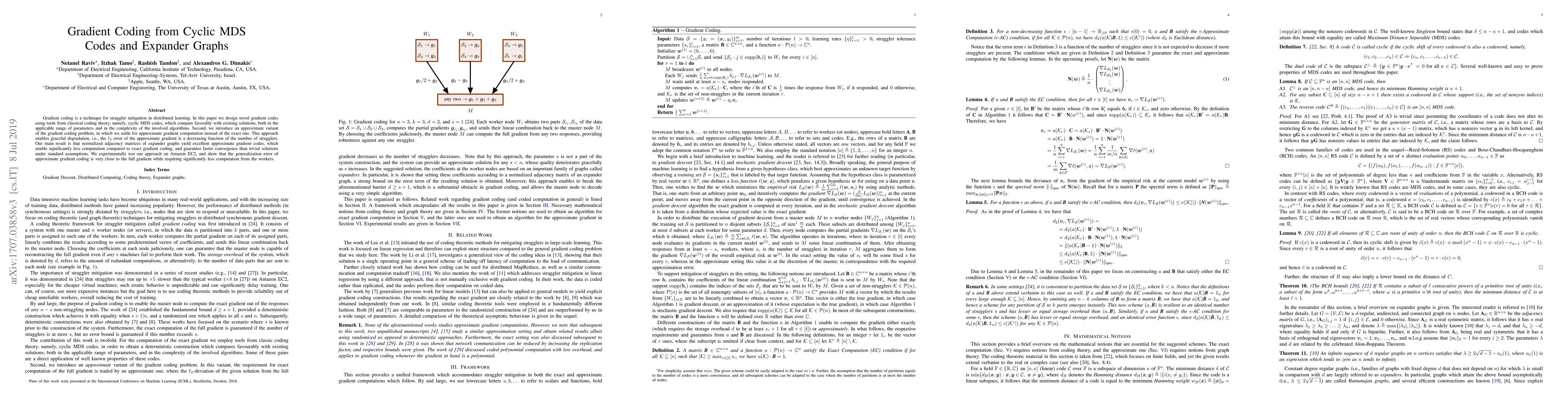 This paper proposes gradient codes based on cyclic MDS codes and expander graphs for straggler mitigation in distributed learning, demonstrating improved performance over existing methods. It also introduces an approximate gradient coding approach using expander graphs, which offers faster convergence and less computation while maintaining low generalization error.