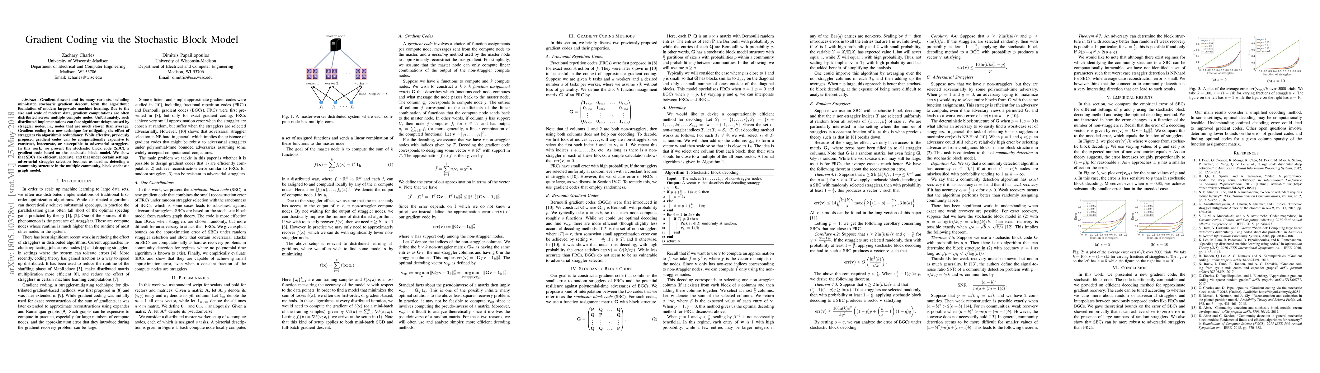 Gradient descent and its many variants, including mini-batch stochastic gradient descent, form the algorithmic foundation of modern large-scale machine learning. Due to the size and scale of modern data, gradient computations are often distributed across multiple compute nodes. Unfortunately, such distributed implementations can face significant delays caused by straggler nodes, i.e., nodes that are much slower than average. Gradient coding is a new technique for mitigating the effect of stragglers via algorithmic redundancy. While effective, previously proposed gradient codes can be computationally expensive to construct, inaccurate, or susceptible to adversarial stragglers. In this work, we present the stochastic block code (SBC), a gradient code based on the stochastic block model. We show that SBCs are efficient, accurate, and that under certain settings, adversarial straggler selection becomes as hard as detecting a community structure in the multiple community, block stochastic graph model.