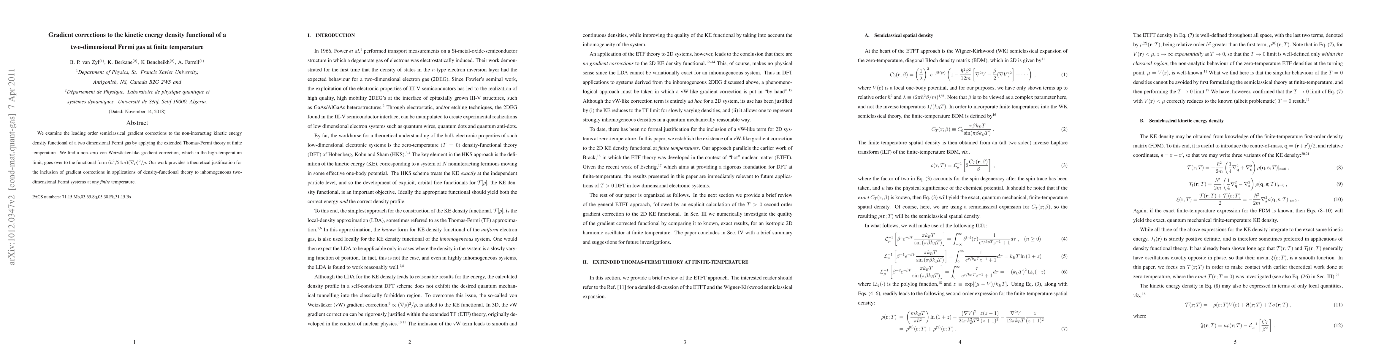 We examine the leading order semiclassical gradient corrections to the non-interacting kinetic energy density functional of a two dimensional Fermi gas by applying the extended Thomas-Fermi theory at finite temperature. We find a non-zero von Weizs\"acker-like gradient correction, which in the high-temperature limit, goes over to the familiar functional form $(\hbar^2/24m) (\nabla\rho)^2/\rho$. Our work provides a theoretical justification for the inclusion of gradient corrections in applications of density-functional theory to inhomogeneous two-dimensional Fermi systems at any {\em finite} temperature.