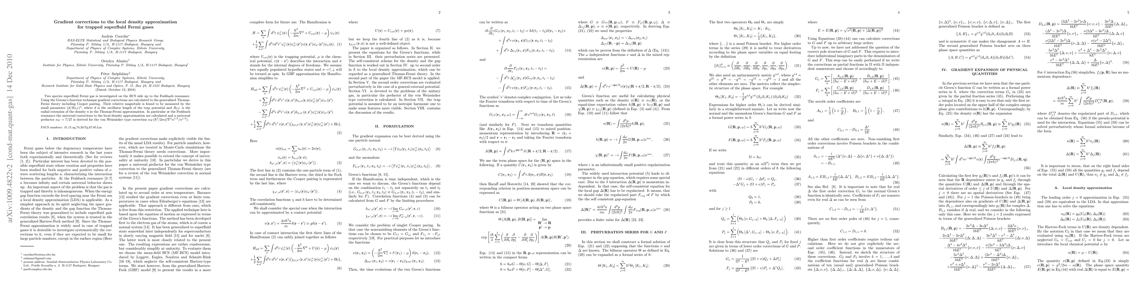 This paper investigates gradient corrections to the local density approximation for a two-species superfluid Fermi gas, employing the Greens's function technique. It finds that these corrections are proportional to $(d/R_{TF})^4$ and introduces a universal prefactor $\kappa_W=7/27$ for the von Weizsäcker correction term.